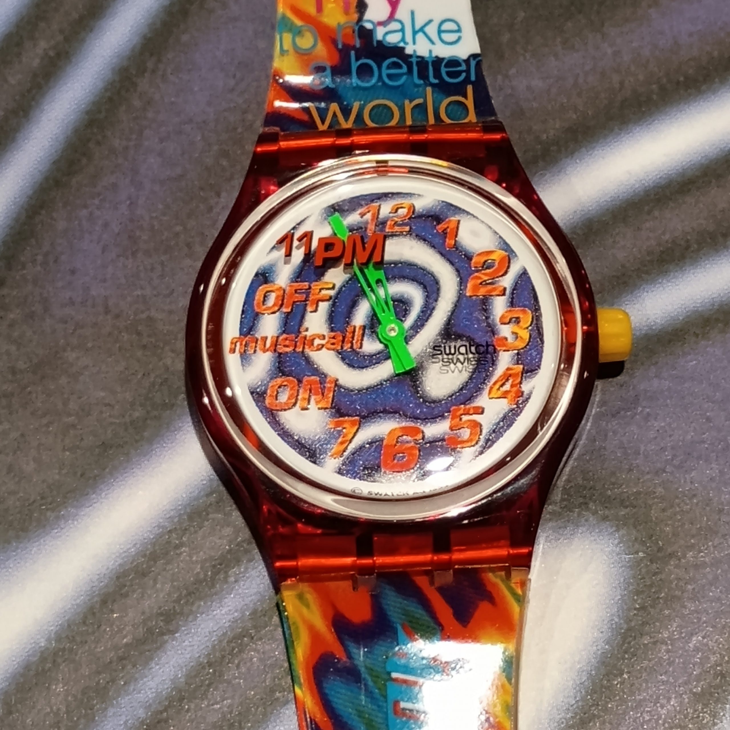 Dial: Multi-coloured with pop-art inspired graphics — often featuring text like “ON musica OFF 11PM 12” and vibrant patterns tied to the musical theme