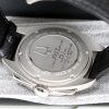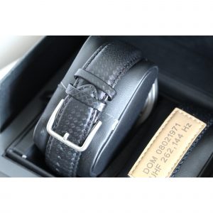 - The watch is secured on the wrist using a black leather strap that fastens with a pin buckle. The watch also comes with an interchangeable black NATO strap.