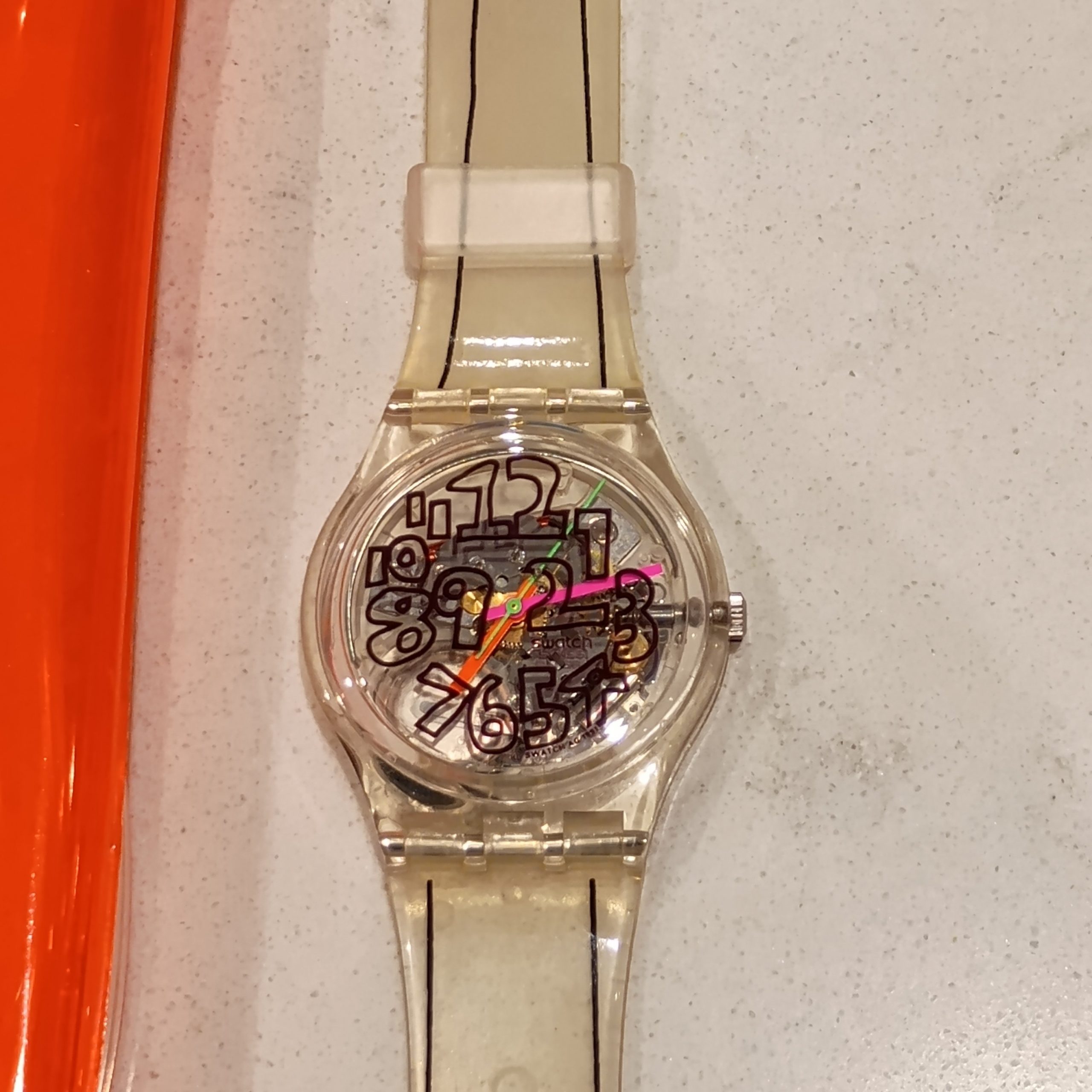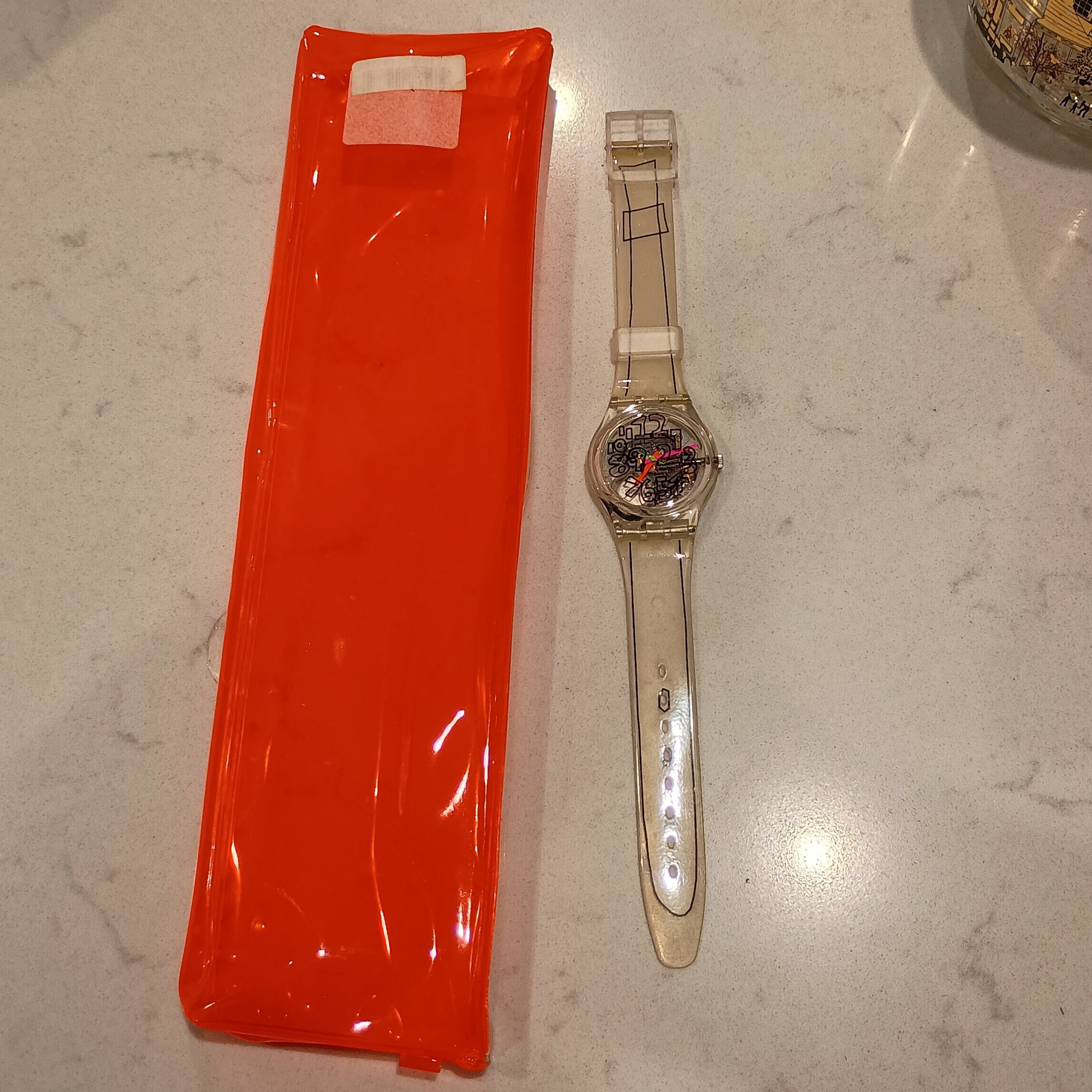 This is a 1993 Swatch Gent Club Special “Scribble” GZ124 watch with a clear plastic case and transparent two-piece silicone strap.