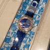 - The watch has a multi-color dial and a two-piece blue plastic strap.