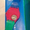 - The plastic case is pink/magenta, and the two-piece strap is split between green and blue sections.