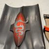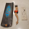 - It has a leather strap with a flame pattern in red, orange, and blue.