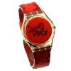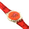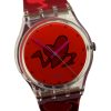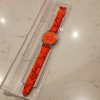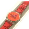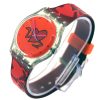 - It features a clear plastic case, a neon orange dial, and a red band, all adorned with a stylized heart design.